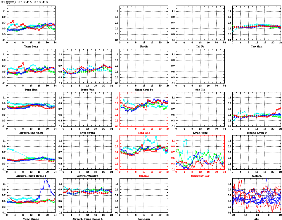 | Air Quality Data Time Series for CO (2018/04/18) | ( Line colors: Day -3 Day -2 Day -1 Current day ) | 2D Map Current AQHI |