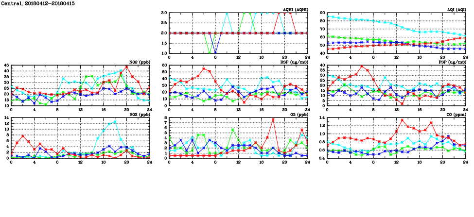 | Air Quality Data Time Series in Central (2018/04/15) | ( Line colors: Day -3 Day -2 Day -1 Current day ) | 2D Map Current AQHI |