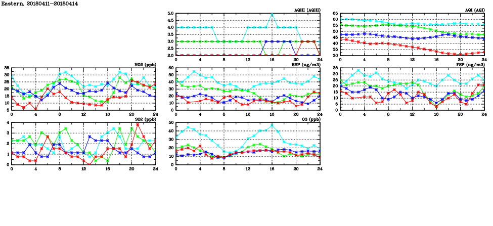| Air Quality Data Time Series in Eastern (2018/04/14) | ( Line colors: Day -3 Day -2 Day -1 Current day ) | 2D Map Current AQHI |