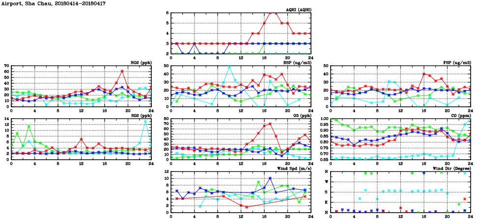 | Air Quality Data Time Series in Airport, Sha Chau (2018/04/17) | ( Line colors: Day -3 Day -2 Day -1 Current day ) | 2D Map Current AQHI |