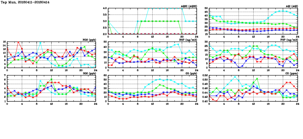 | Air Quality Data Time Series in Tap Mun (2018/04/14) | ( Line colors: Day -3 Day -2 Day -1 Current day ) | 2D Map Current AQHI |