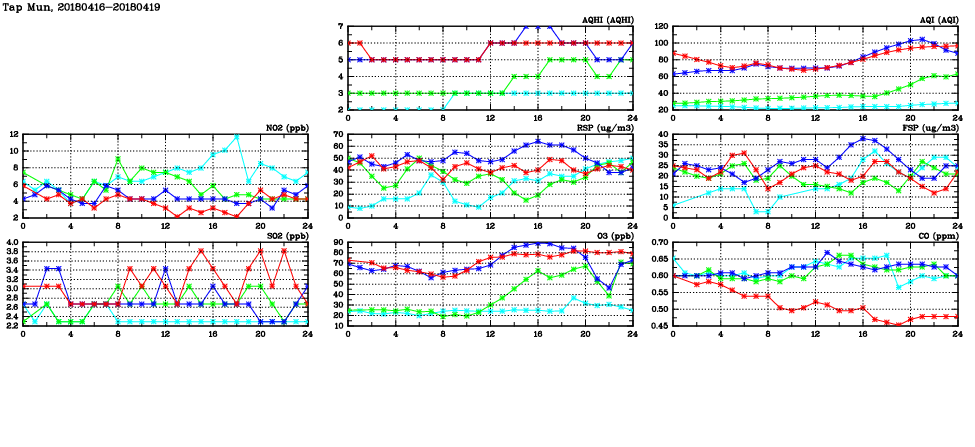 | Air Quality Data Time Series in Tap Mun (2018/04/19) | ( Line colors: Day -3 Day -2 Day -1 Current day ) | 2D Map Current AQHI |