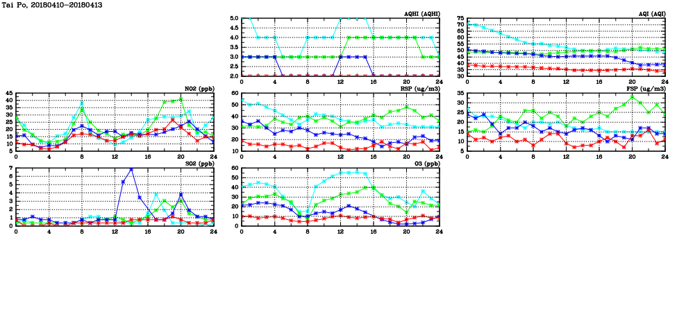 | Air Quality Data Time Series in Tai Po (2018/04/13) | ( Line colors: Day -3 Day -2 Day -1 Current day ) | 2D Map Current AQHI |