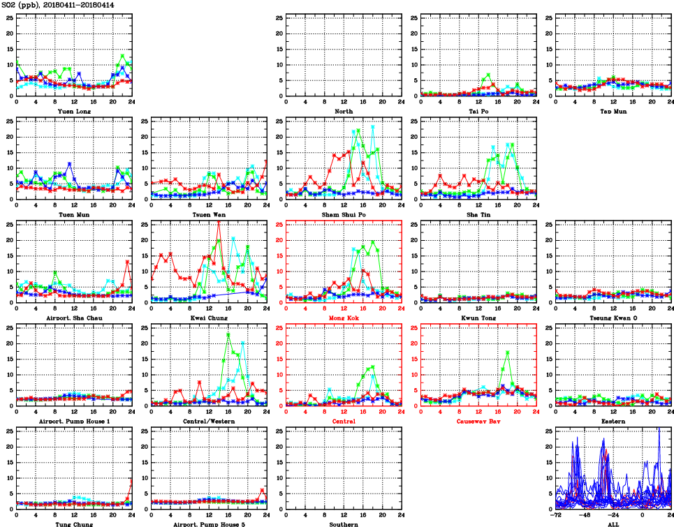 | Air Quality Data Time Series for SO2 (2018/04/14) | ( Line colors: Day -3 Day -2 Day -1 Current day ) | 2D Map Current AQHI |