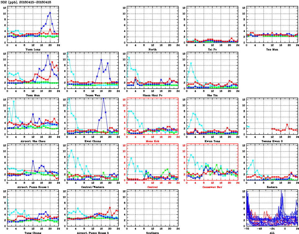 | Air Quality Data Time Series for SO2 (2018/04/18) | ( Line colors: Day -3 Day -2 Day -1 Current day ) | 2D Map Current AQHI |
