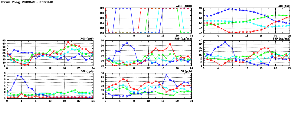 | Air Quality Data Time Series in Kwun Tong (2018/04/16) | ( Line colors: Day -3 Day -2 Day -1 Current day ) | 2D Map Current AQHI |