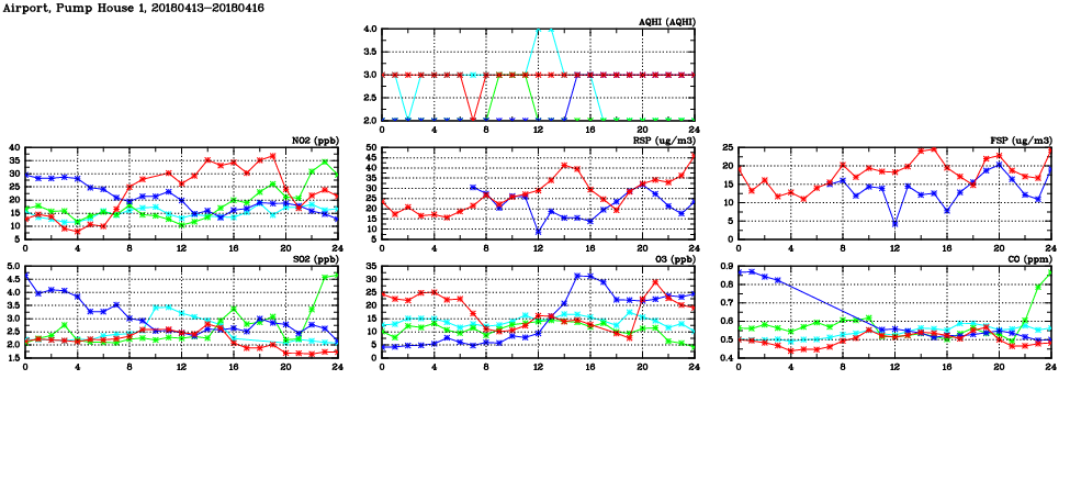 | Air Quality Data Time Series in Airport, Pump House 1 (2018/04/16) | ( Line colors: Day -3 Day -2 Day -1 Current day ) | 2D Map Current AQHI |