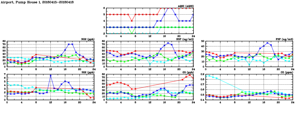 | Air Quality Data Time Series in Airport, Pump House 1 (2018/04/18) | ( Line colors: Day -3 Day -2 Day -1 Current day ) | 2D Map Current AQHI |
