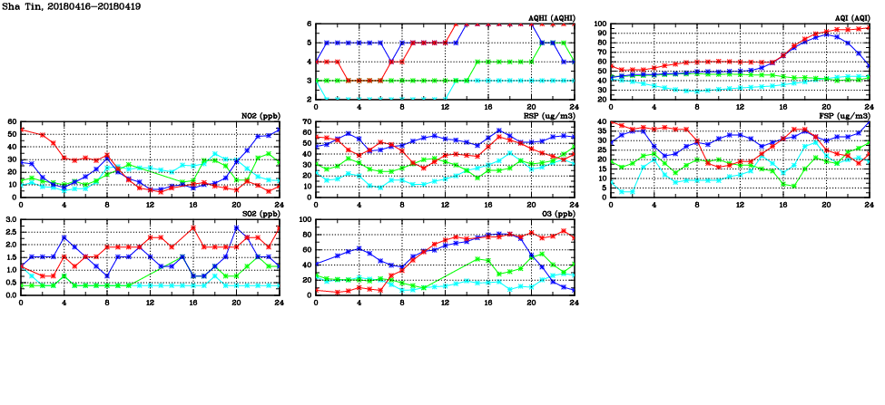 | Air Quality Data Time Series in Sha Tin (2018/04/19) | ( Line colors: Day -3 Day -2 Day -1 Current day ) | 2D Map Current AQHI |