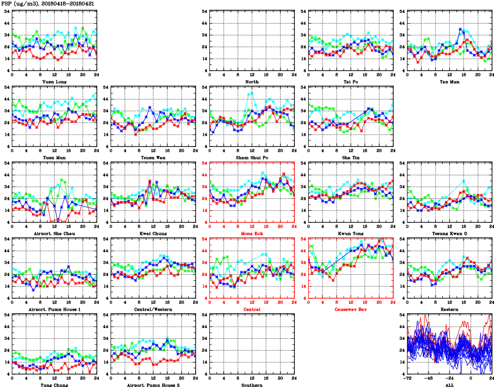 | Air Quality Data Time Series for FSP (2018/04/21) | ( Line colors: Day -3 Day -2 Day -1 Current day ) | 2D Map Current AQHI |