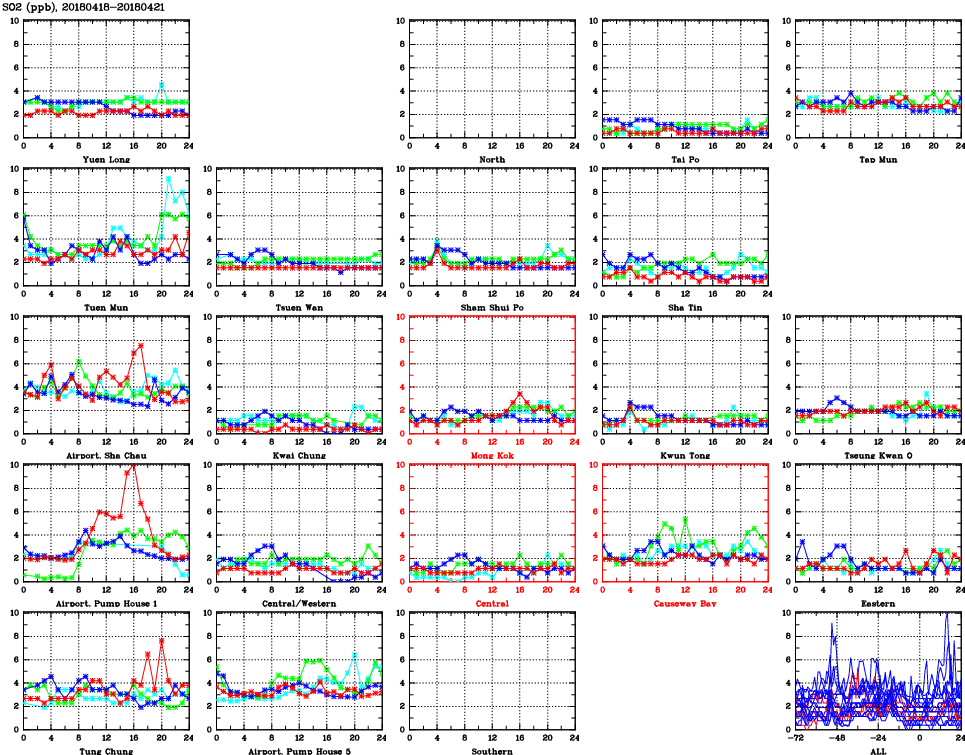 | Air Quality Data Time Series for SO2 (2018/04/21) | ( Line colors: Day -3 Day -2 Day -1 Current day ) | 2D Map Current AQHI |