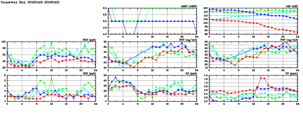 | Air Quality Data Time Series in Causeway Bay (2018/04/21) | ( Line colors: Day -3 Day -2 Day -1 Current day ) | 2D Map Current AQHI |
