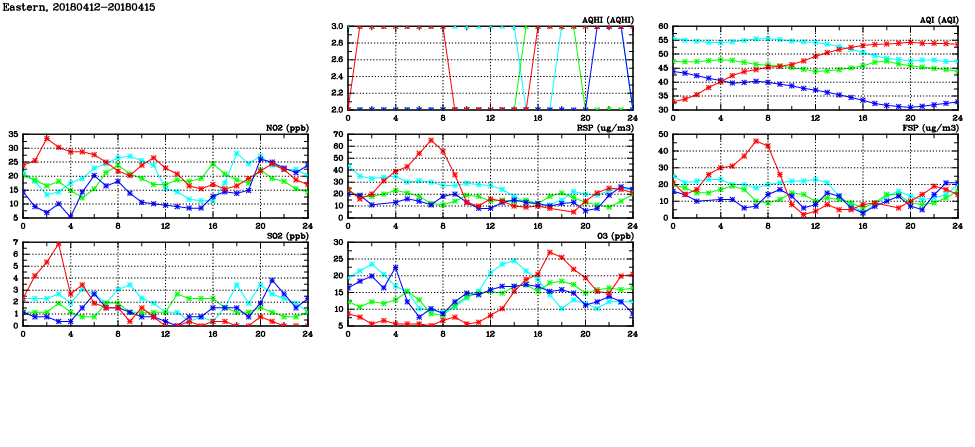 | Air Quality Data Time Series in Eastern (2018/04/15) | ( Line colors: Day -3 Day -2 Day -1 Current day ) | 2D Map Current AQHI |