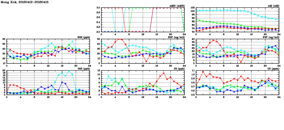 | Air Quality Data Time Series in Mong Kok (2018/04/15) | ( Line colors: Day -3 Day -2 Day -1 Current day ) | 2D Map Current AQHI |