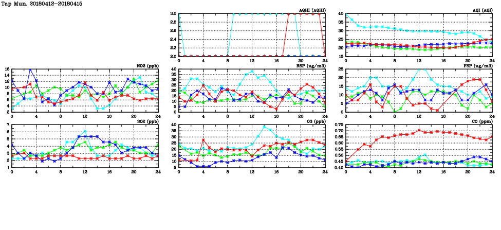 | Air Quality Data Time Series in Tap Mun (2018/04/15) | ( Line colors: Day -3 Day -2 Day -1 Current day ) | 2D Map Current AQHI |