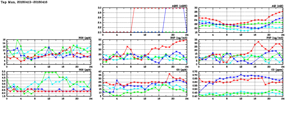 | Air Quality Data Time Series in Tap Mun (2018/04/16) | ( Line colors: Day -3 Day -2 Day -1 Current day ) | 2D Map Current AQHI |