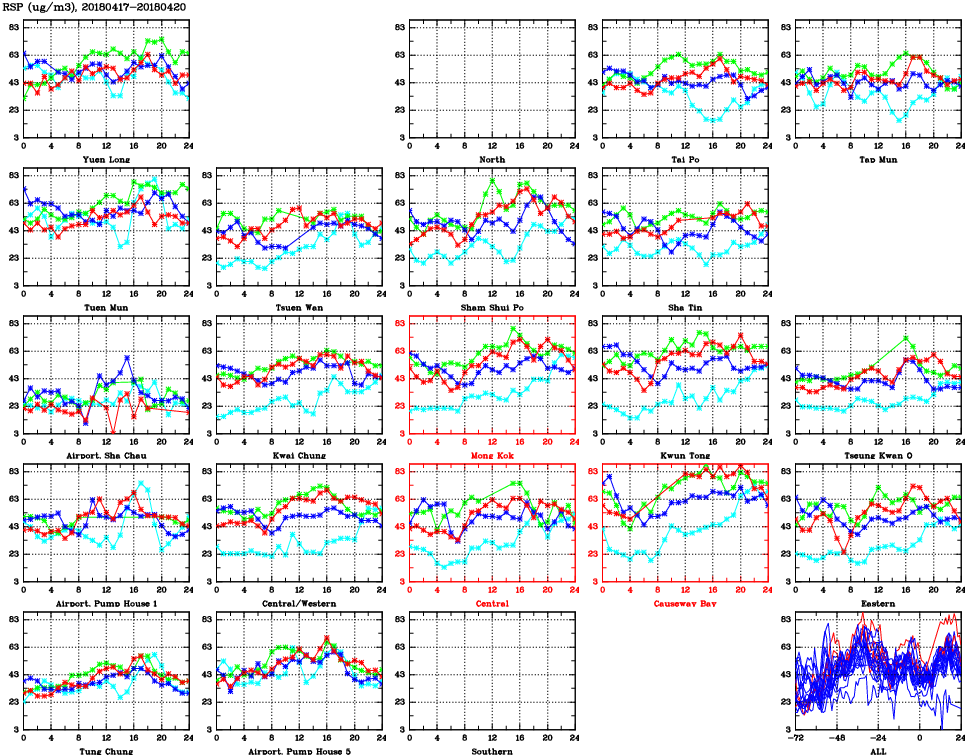 | Air Quality Data Time Series for RSP (2018/04/20) | ( Line colors: Day -3 Day -2 Day -1 Current day ) | 2D Map Current AQHI |