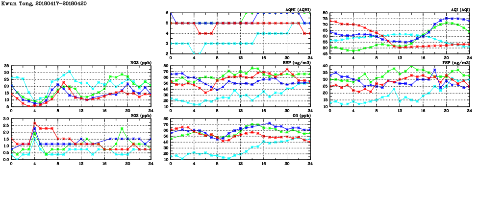 Air Quality Data Time Series in Kwun Tong (2018/04/20) ( Line colors: Day -3 Day -2 Day -1 Current day ) 2D Map   Current AQHI