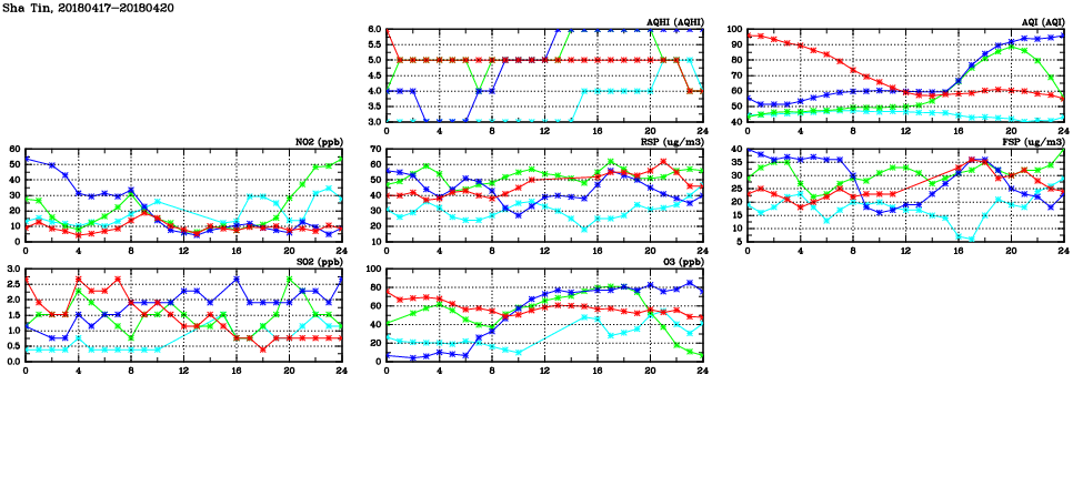 | Air Quality Data Time Series in Sha Tin (2018/04/20) | ( Line colors: Day -3 Day -2 Day -1 Current day ) | 2D Map Current AQHI |