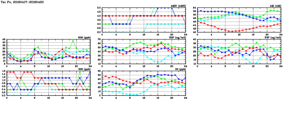 | Air Quality Data Time Series in Tai Po (2018/04/20) | ( Line colors: Day -3 Day -2 Day -1 Current day ) | 2D Map Current AQHI |
