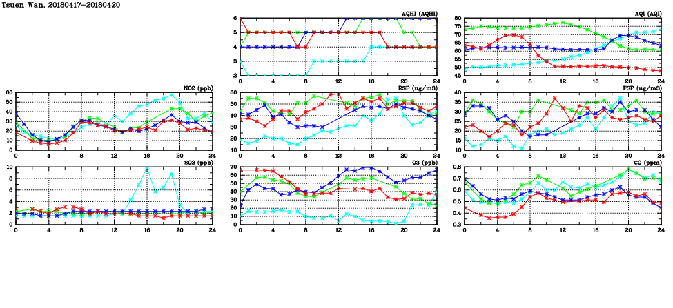 | Air Quality Data Time Series in Tsuen Wan (2018/04/20) | ( Line colors: Day -3 Day -2 Day -1 Current day ) | 2D Map Current AQHI |