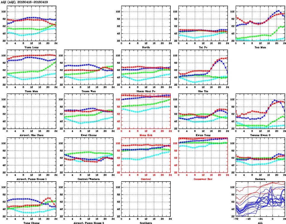 | Air Quality Data Time Series for AQI (2018/04/19) | ( Line colors: Day -3 Day -2 Day -1 Current day ) | 2D Map Current AQHI |