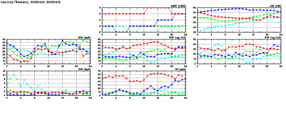 | Air Quality Data Time Series in Central/Western (2018/04/18) | ( Line colors: Day -3 Day -2 Day -1 Current day ) | 2D Map Current AQHI |