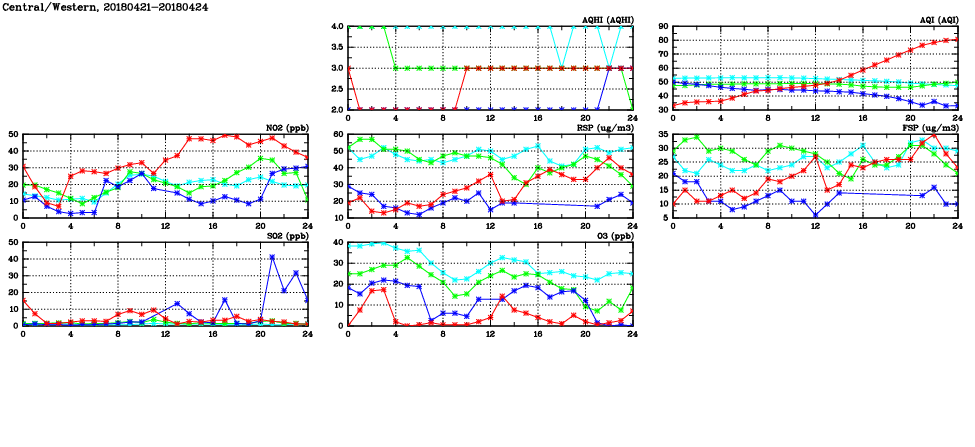 | Air Quality Data Time Series in Central/Western (2018/04/24) | ( Line colors: Day -3 Day -2 Day -1 Current day ) | 2D Map Current AQHI |