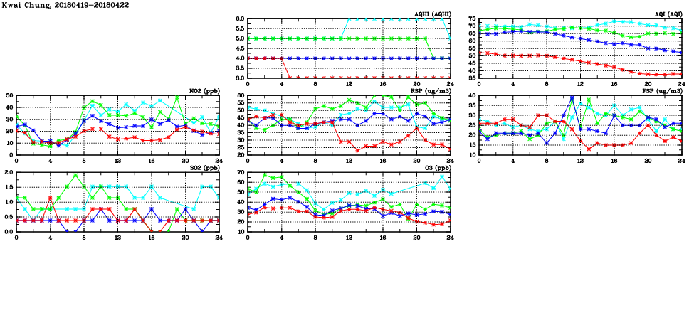 | Air Quality Data Time Series in Kwai Chung (2018/04/22) | ( Line colors: Day -3 Day -2 Day -1 Current day ) | 2D Map Current AQHI |