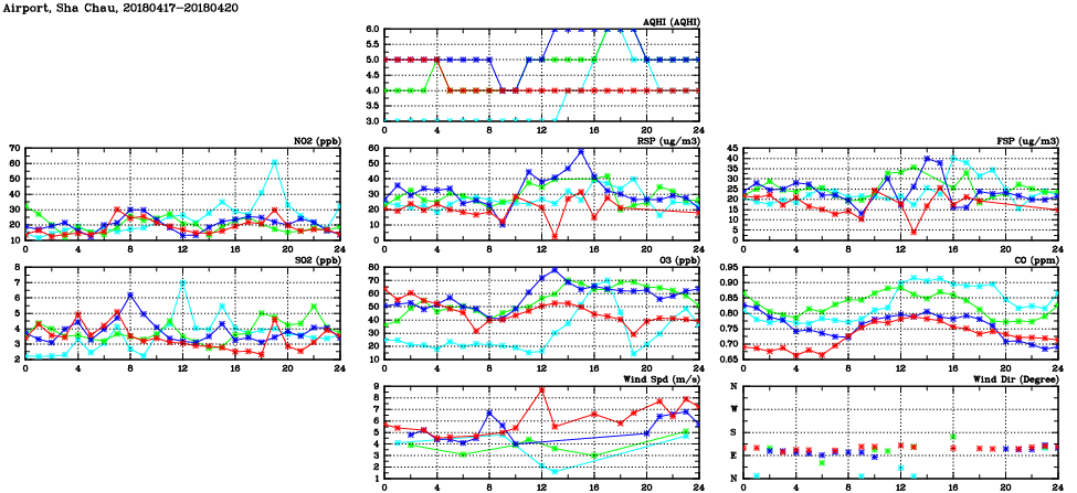| Air Quality Data Time Series in Airport, Sha Chau (2018/04/20) | ( Line colors: Day -3 Day -2 Day -1 Current day ) | 2D Map Current AQHI |