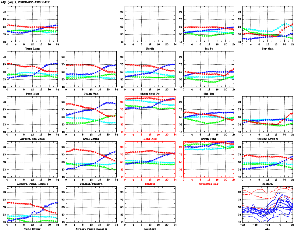 | Air Quality Data Time Series for AQI (2018/04/25) | ( Line colors: Day -3 Day -2 Day -1 Current day ) | 2D Map Current AQHI |