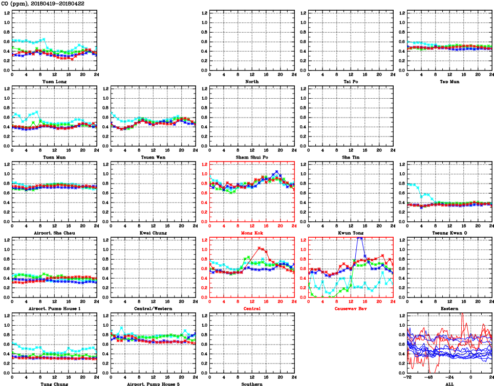 | Air Quality Data Time Series for CO (2018/04/22) | ( Line colors: Day -3 Day -2 Day -1 Current day ) | 2D Map Current AQHI |