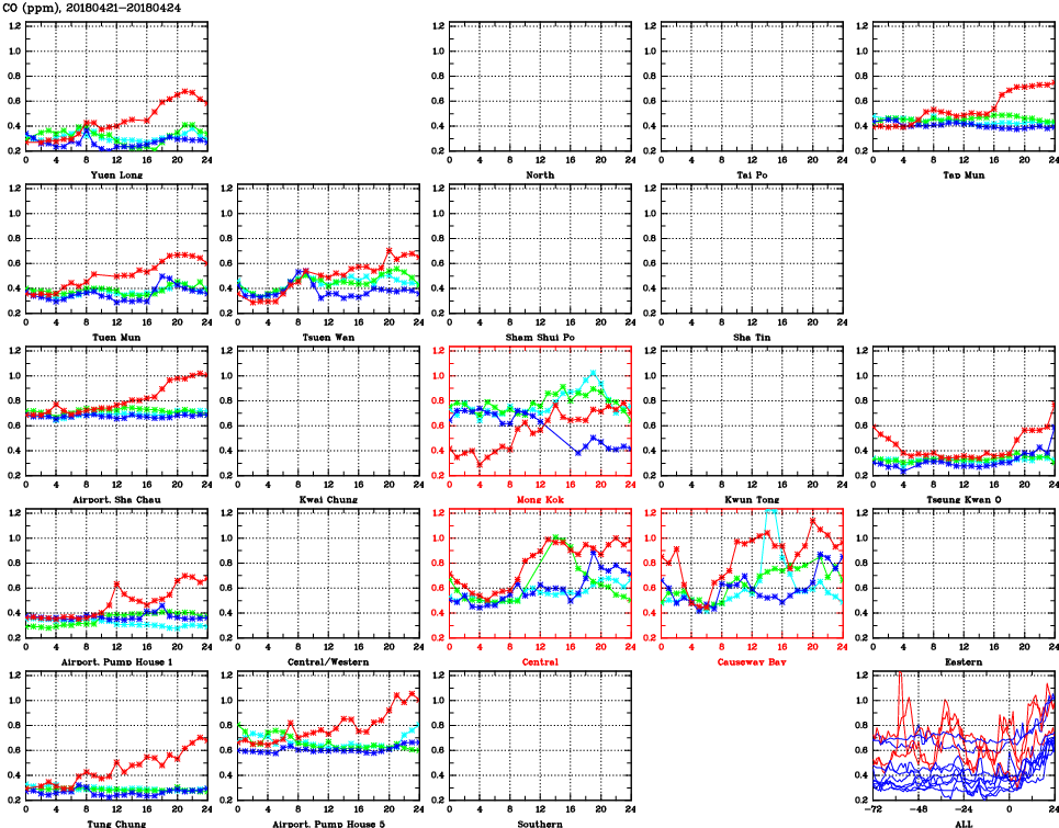 | Air Quality Data Time Series for CO (2018/04/24) | ( Line colors: Day -3 Day -2 Day -1 Current day ) | 2D Map Current AQHI |