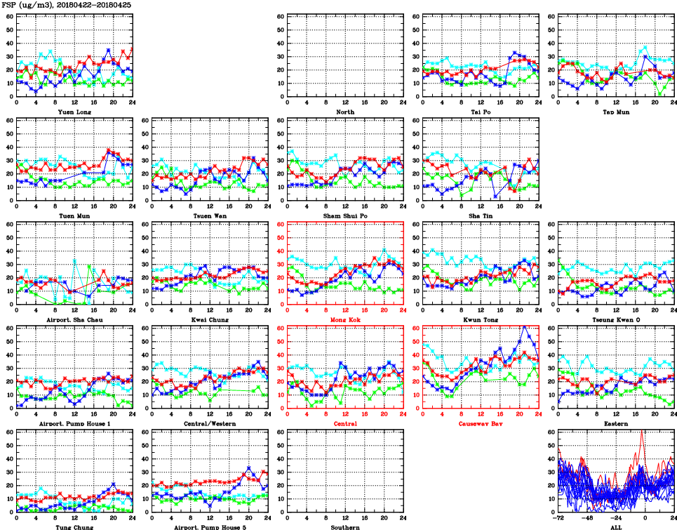| Air Quality Data Time Series for FSP (2018/04/25) | ( Line colors: Day -3 Day -2 Day -1 Current day ) | 2D Map Current AQHI |