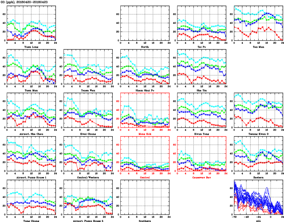 | Air Quality Data Time Series for O3 (2018/04/23) | ( Line colors: Day -3 Day -2 Day -1 Current day ) | 2D Map Current AQHI |