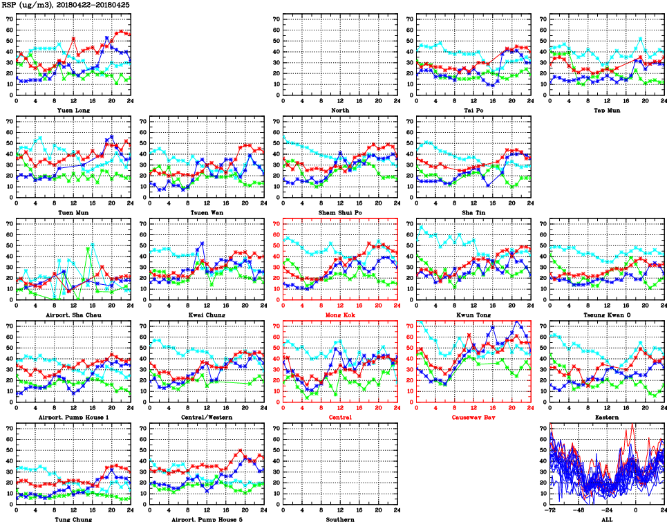 | Air Quality Data Time Series for RSP (2018/04/25) | ( Line colors: Day -3 Day -2 Day -1 Current day ) | 2D Map Current AQHI |