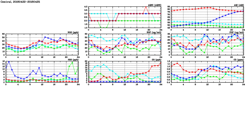 | Air Quality Data Time Series in Central (2018/04/25) | ( Line colors: Day -3 Day -2 Day -1 Current day ) | 2D Map Current AQHI |