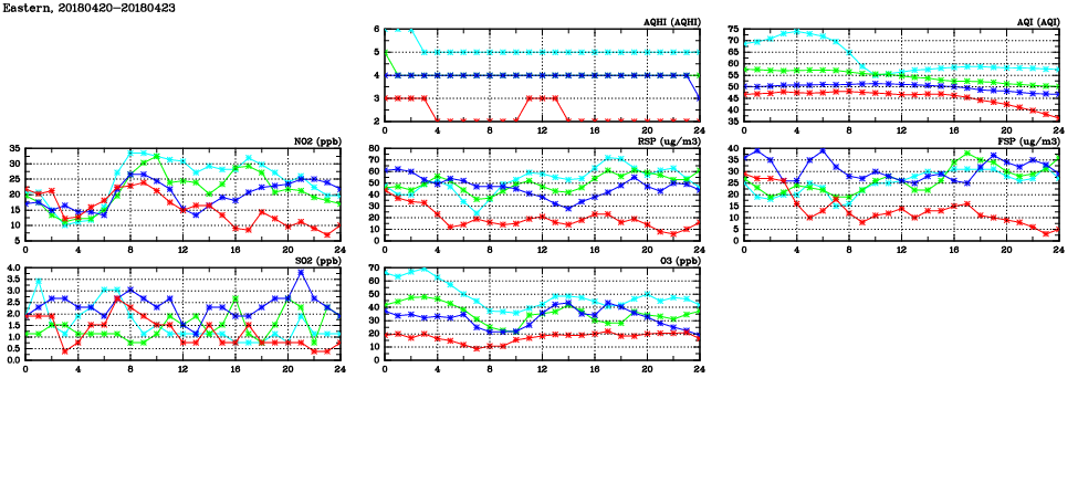 | Air Quality Data Time Series in Eastern (2018/04/23) | ( Line colors: Day -3 Day -2 Day -1 Current day ) | 2D Map Current AQHI |