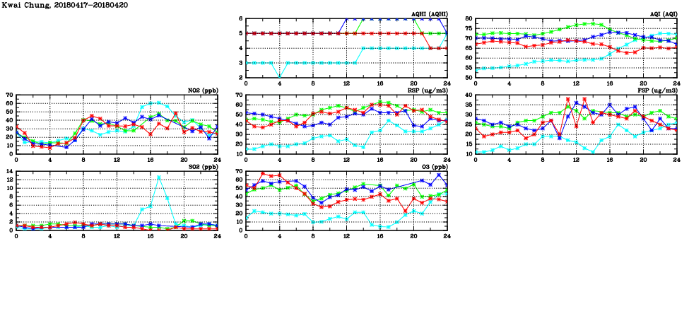 | Air Quality Data Time Series in Kwai Chung (2018/04/20) | ( Line colors: Day -3 Day -2 Day -1 Current day ) | 2D Map Current AQHI |