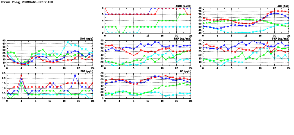 | Air Quality Data Time Series in Kwun Tong (2018/04/19) | ( Line colors: Day -3 Day -2 Day -1 Current day ) | 2D Map Current AQHI |