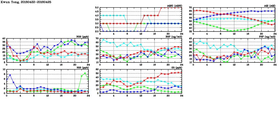 | Air Quality Data Time Series in Kwun Tong (2018/04/25) | ( Line colors: Day -3 Day -2 Day -1 Current day ) | 2D Map Current AQHI |