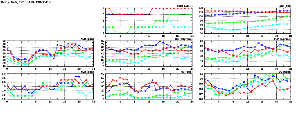 | Air Quality Data Time Series in Mong Kok (2018/04/19) | ( Line colors: Day -3 Day -2 Day -1 Current day ) | 2D Map Current AQHI |