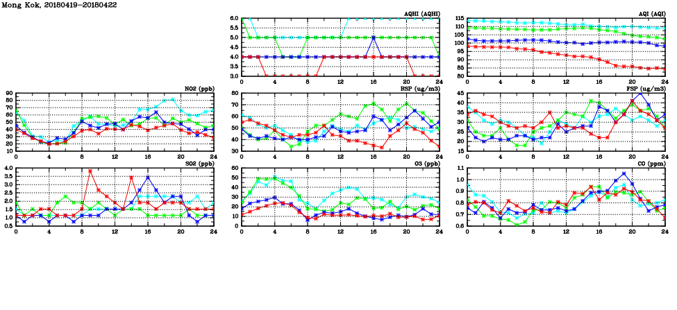 | Air Quality Data Time Series in Mong Kok (2018/04/22) | ( Line colors: Day -3 Day -2 Day -1 Current day ) | 2D Map Current AQHI |