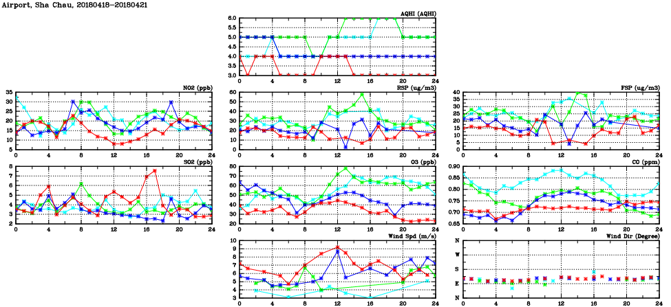 | Air Quality Data Time Series in Airport, Sha Chau (2018/04/21) | ( Line colors: Day -3 Day -2 Day -1 Current day ) | 2D Map Current AQHI |