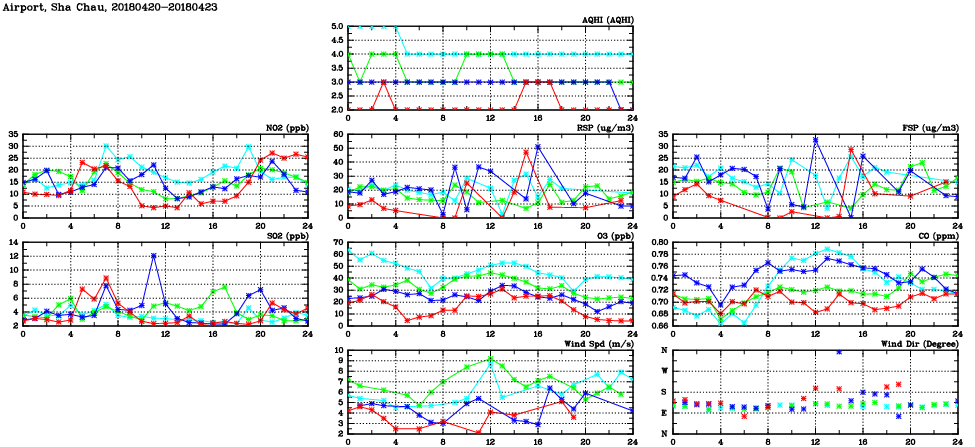 | Air Quality Data Time Series in Airport, Sha Chau (2018/04/23) | ( Line colors: Day -3 Day -2 Day -1 Current day ) | 2D Map Current AQHI |
