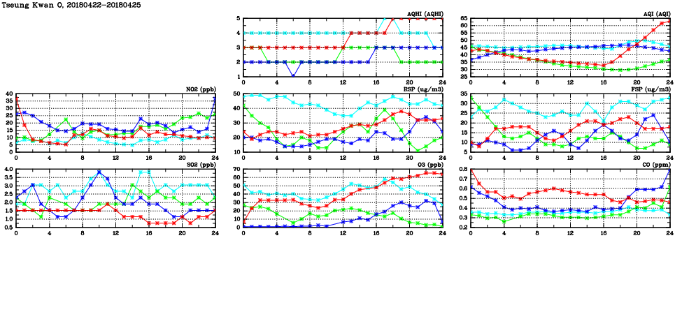 | Air Quality Data Time Series in Tseung Kwan O (2018/04/25) | ( Line colors: Day -3 Day -2 Day -1 Current day ) | 2D Map Current AQHI |