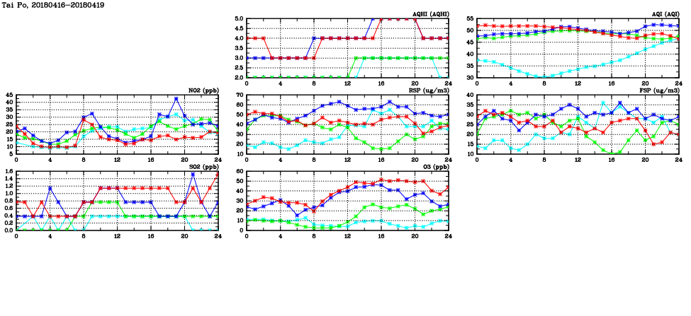 | Air Quality Data Time Series in Tai Po (2018/04/19) | ( Line colors: Day -3 Day -2 Day -1 Current day ) | 2D Map Current AQHI |