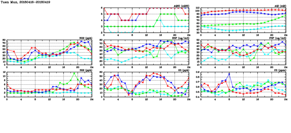 | Air Quality Data Time Series in Tuen Mun (2018/04/19) | ( Line colors: Day -3 Day -2 Day -1 Current day ) | 2D Map Current AQHI |