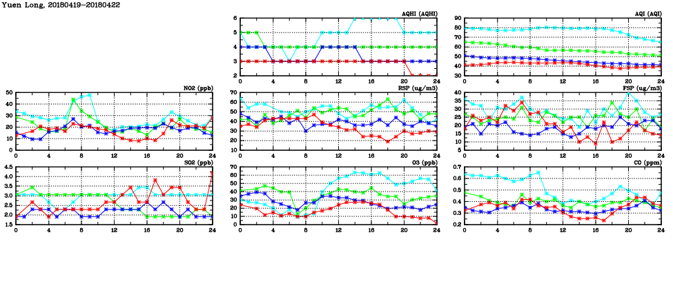 | Air Quality Data Time Series in Yuen Long (2018/04/22) | ( Line colors: Day -3 Day -2 Day -1 Current day ) | 2D Map Current AQHI |