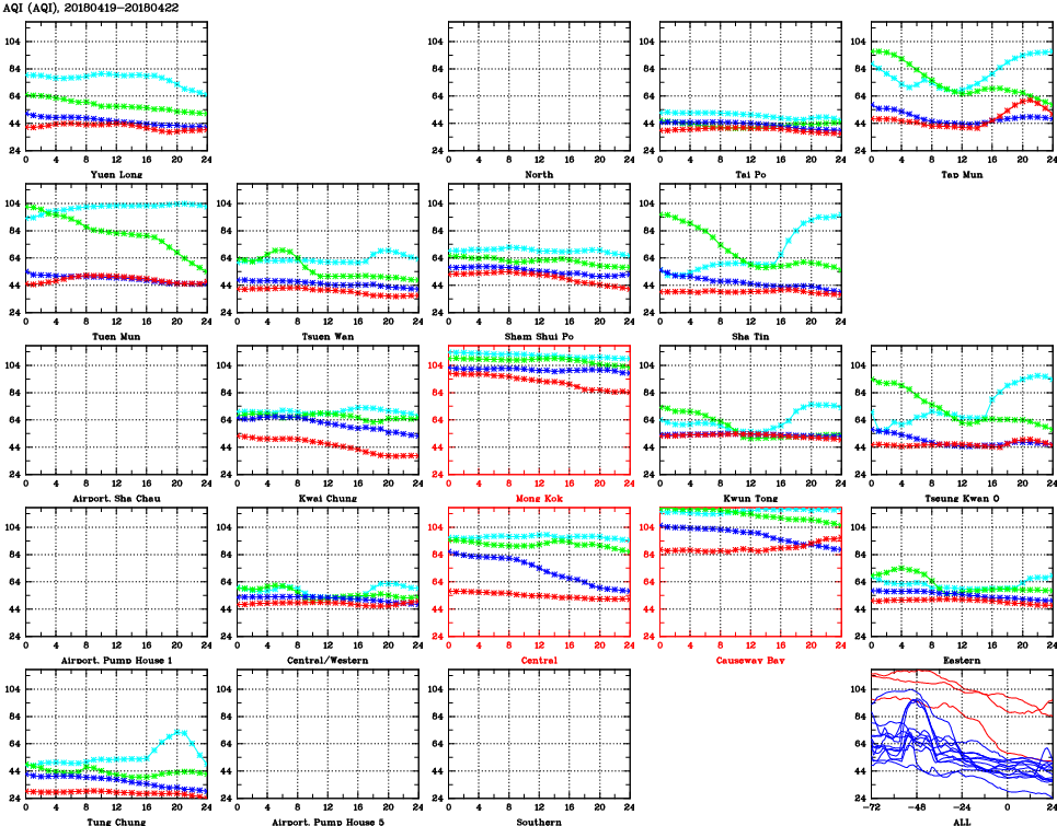 | Air Quality Data Time Series for AQI (2018/04/22) | ( Line colors: Day -3 Day -2 Day -1 Current day ) | 2D Map Current AQHI |